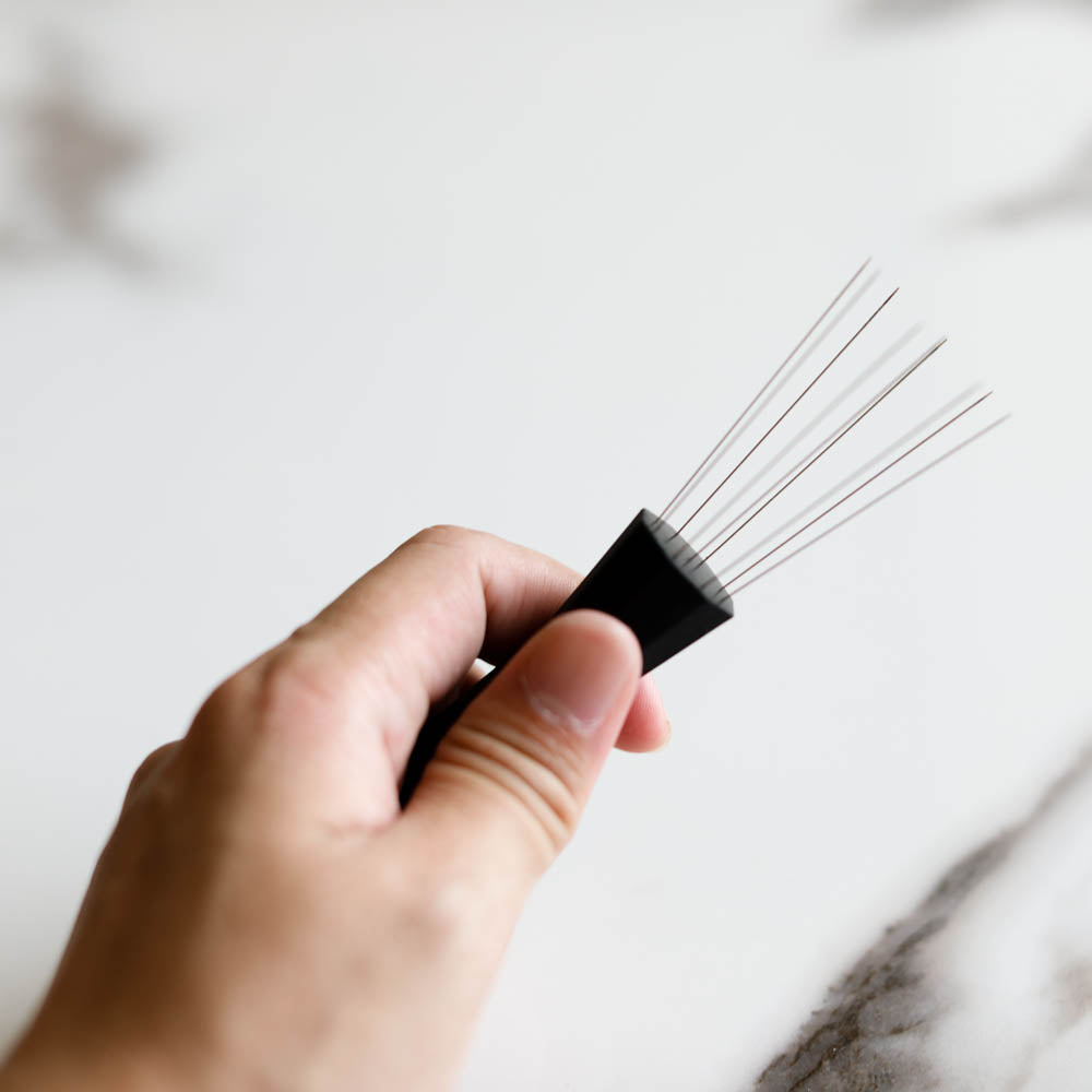 - ใช้เกลี่ยผงกาแฟไม่ให้จับตัวเป็นก้อน ให้ผงกระจายทั่วบาสเก็ต ไม่เกิดพื้นที่ที่มีกาแฟบางหรือแน่นกว่า เมื่อพี้นที่ทั้งหมดมีความหนาแน่นเท่ากัน จะทำให้การสกัดกาแฟออกมาดี